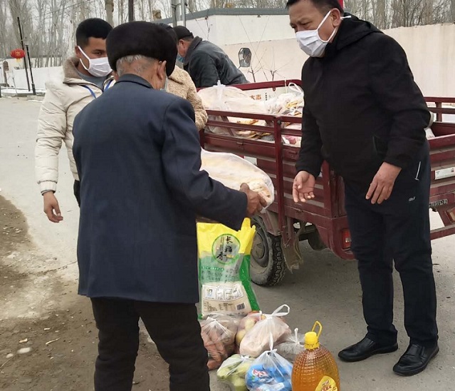此次疫情防控中,由于不能外出,部分群众没有收入,致使生活困难。为此,赛里木村工作队协同村委会摸排全村困难家庭,筛选出21户困难户,决定从工作队为民办实事经费中,为困难群众购买生活物资,解决困难。2月18日下午,赛里木村工作队、村干部在工作队长、村第一书记艾斯卡尔.艾买提的带领下,开展扶贫帮困活动,上门为21户困难群众送去价值6300余元的米、面、油、肉、馕等生活物资,为群众解决了生活困难。