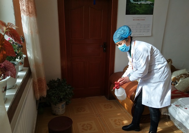 我们的村医“阿斯古丽”每天早上8点钟天刚蒙蒙亮就起床开始做好走访居家户的前期准备工作,穿上白大褂、戴上口罩、背起诊疗箱,手提消毒液前往正在居家隔离观察的群众家里进行测体温,消毒,还要宣传有关新冠病毒感染的预防方面的知识和注意事项。他始终忙碌在农村疫情防控一线积极地为居家医学观察的从疫区返乡来的学生和群众开展健康监测,做好基层新冠肺炎疫情防控。