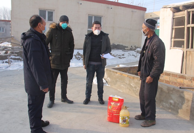 2020年2月11日入户排查20户困难群众和孤寡老人家中,没有钱购买米面油等基本生活用品。第1村民小组贫困户古丽扎热木·玉努斯、第3村民小组的孤寡老人木沙·艾莎家中没有米面油,工作队员立即给老人送去了面粉和鸡蛋等吃的,同时工作队队员给老人木沙·艾莎教如何正确佩戴口罩,防止病毒传染,保证了老人基本生活。