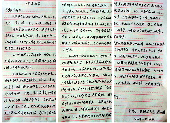 “我申请加入中国共产党,我愿意为党奉献终身,听党指挥,永不叛党,做一名全心全意为人民服务的党员”呼吸内科的90后女孩李水鑫,大家都叫她“水妹”,五年来,从未在家过一个完整的春节,把团聚留给了别人,在组织召唤的时候,毅然请战,“我有呼吸内科的工作经验,我请战!随时听候调令,义无反顾奔赴前线,做出自己应有的贡献!”。