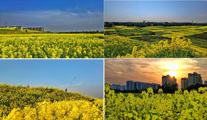 暖风吹过,站在土坡从远处望,那满目遍野的鹅黄,与根茎上的嫩绿,二者色调所形成的明暗反差,格外醒目,构成春日里一幅独特的田园风景画。走在油菜花田里,清新、自由、沁人心脾的香味让人心旷神怡、流连忘返。不知不觉中,你会被眼前这种迷人色彩所陶醉。(崔寿伟)