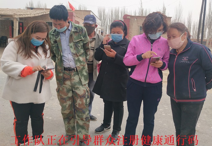 清风网讯(阿瓦提县机关事务管理办公室:热沙来提.艾麦尔)2020年3月28日至4月2日丰收片区库木巴什库勒村工作队辖区二组路口引导村民扫描二维码注册健康通行码,村民领取健康码。