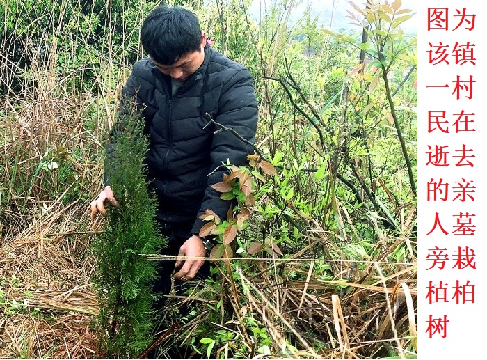 在该镇江村一处山地看到,当天上午,不少村民拿着锄头和树苗上山到到坟地里栽植树苗,树苗品种主要是松树、杉树和柏树等。“爷爷去世至今有16年了,往年我在外地务工,有时年关都没有回家,只是在清明节回家一次,今天我特意买来几株树苗栽植在逝去的爷爷墓旁,以表达对爷爷的思念之情。”该镇江村一位年轻村民说。