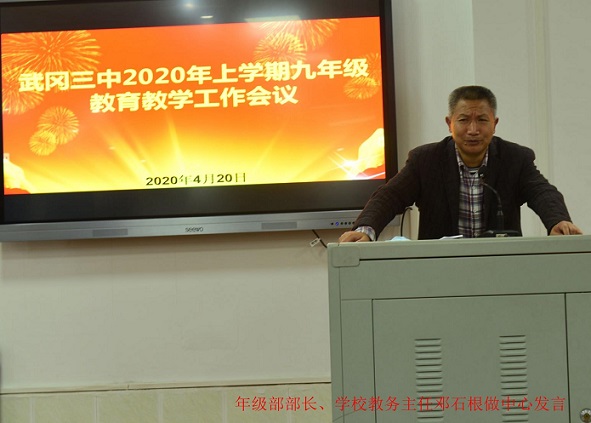 年级部部长、学校教务主任邓石根做中心发言,首先,他对上期期末考试各学科成绩、班级总体情况及学科分段排名情况进行了详细分析、比较。找到了好的方面及存在的问题,为下一步工作指明了道路。其次,对下一步工作进行了科学安排,确定了九年级各班今年中考的奋斗目标,他要求全体九年级老师要加强紧迫感,牢记使命,提高工作效率,把握好教学进度,在做好疫情防控的情况下,保证教学质量,完成学校分给各班的升学指标,给全市人民交上一份满意的答卷。邓主任的讲话高屋建瓴,为全体初三教师本期的教育教学工作指明了前进方向。