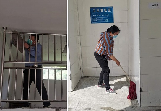 清风网讯(通讯员 谭百康 段祯祯) 5月22日上午, 英山县杨柳湾镇白马石小学开展“防疫情、洁校园、保复学”的第二次卫生大扫除活动。活动中,老师们干劲十足,喷洒消毒药水,地面扫帚清扫、清水清洗,天花板长刷清扫,栏杆用消毒水彻底擦洗,通过一上午的劳作,校园环境明显改善,垃圾杂物有效清理,校园环境干净整洁,校容校貌焕然一新。为做好学校复学复课相关准备工作,确保师生生命安全和身体健康,营造洁净、优美的校园环境。