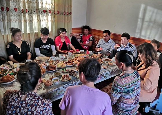 在走访慰问中,来到了驻村工作队第一书记麦合木提江•阿合尼亚孜的结亲户古拉依木•托乎提家,古拉依木•托乎提一家人热情邀请工作队员进门,共庆“肉孜节”。