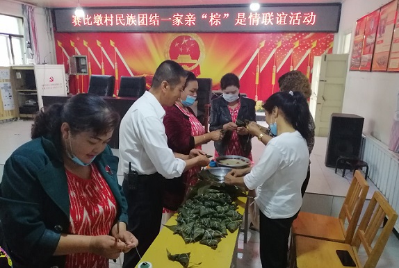 之后大家一起煮粽子,吃粽子,干部将剥好的粽子递到自己的“亲戚”的手上,微笑地看着“亲戚”吃粽子;大家彼此交流,询问“亲戚”生产生活中有什么困难?“亲戚”们和干部畅谈着对未来幸福生活的规划,今年计划怎么发展生产增收致富。大家吃着粽子、水果和点心,跳着欢快地麦西来普,活动室充满了大家的欢歌笑语,一番其乐融融的景象。