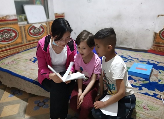 闫小平总是不忘记给孩子们带上礼物或者学习用品,给孩子辅导作业,督促他们学习。通过闫小平长期的国语教育,阿依努尔的女儿口语水平有了突飞猛进的进步,孩子高兴的说语文老师已经好几次让她领读课文了,老师说她的发音标准,吐字清晰,看着孩子童真的笑脸,闫小平像自己亲生的孩子得到表扬一样感到自豪。