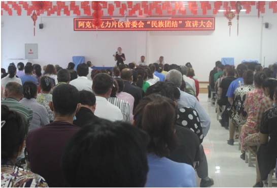 宣讲活动紧紧围绕“加强民族团结、维护祖国统一”的主题,给农牧民群众热情耐心地宣传讲解民族团结的重要性,各民族要平等相待、互相尊重、互相学习、互相帮助,加强各民族之间的团结,使广大干部群众牢固树立“像爱护自己的眼睛一样爱护民族团结,像珍视自己的生命一样珍视民族团结”的思想,为民族团结进步事业夯实思想基础。宣讲结束后组织群众开展了民族团结知识问答,共有本村及周边村群众200余人参加。