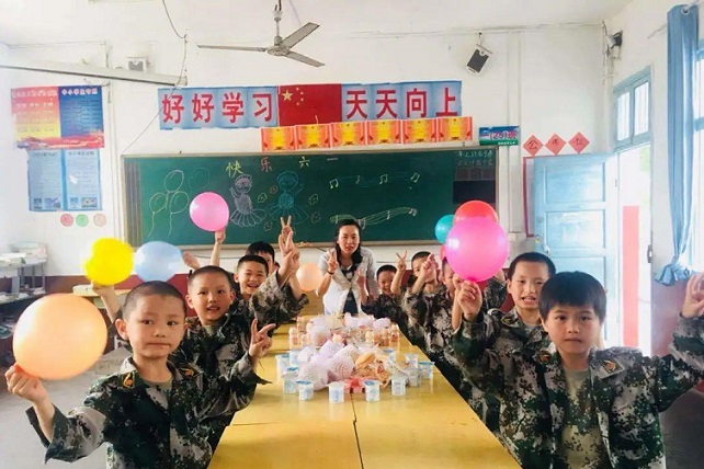 孩子们拿到老师分配的糖果,一个个露出了开心的笑容。
