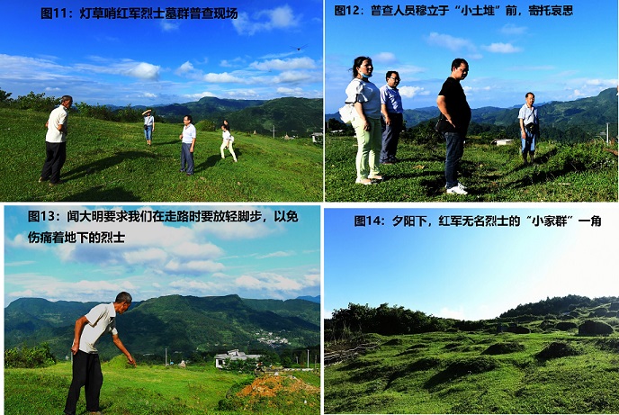 在普查和采访中,当地老农闻大明告诉我们,他在出生一个月后就随母亲从县城投奔到灯草哨,与外祖父解建陆相依为命生活。过去他经常听外祖父说,红军长征过黄平县几天后,国民党部队又气势汹汹地回来威胁百姓,要求“不准给红军收尸、不准帮红军说话、不准收留红军伤员”,否则将严惩不贷和杀头示众。虽然在路边或村寨周围牺牲的红军已被解建陆等人悄悄安葬,但阵亡于深山里的红军战士,人们到春天进山砍柴、放牛被发现时,遗体已严重腐烂,那些情景让人惨不忍睹。最后也被好心的人们偷偷移来尸地坝安葬。