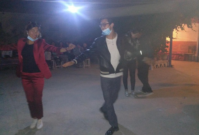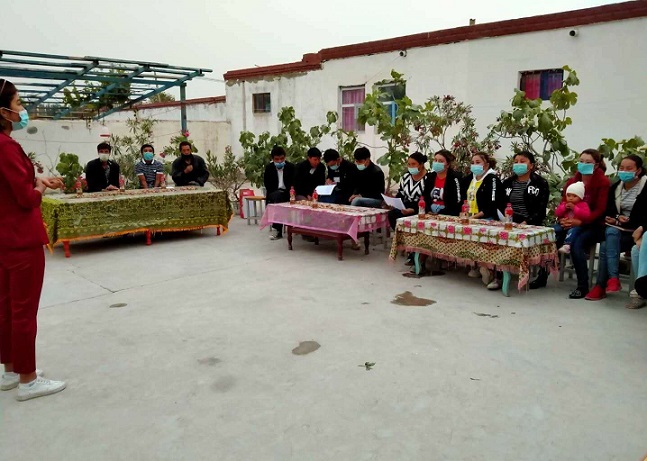 村民与结对干部、驻村工作队、村两委同坐一桌,大家一边吃着水果,一边观赏文艺节目。活动伊始, 干部和群众齐唱《没有共产党就没有新中国》,由工作队员热孜瓦尼古丽·吐尼亚孜带来的独唱《和谐新疆》,优美动听,民族舞《黑走马》、朗诵《三代亲属称呼》以及悠扬的《沙漠骆驼》等精彩节目,赢得了在场观众的阵阵掌声。有关民族团结的知识问答也让村民们更加了解民族团结的相关政策。活动中,干部和结对亲戚一起玩游戏,结对亲戚互相赠送礼物并合影留念,使各民族之间的感情更加深厚了。活动最后,全体工作人员和在场村民一同跳起了欢快的麦西来甫,将此次“民族团结一家亲”联谊活动推向了高潮。