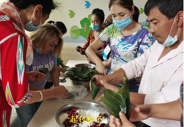 先是开展知识竞赛活动,人社局干部与社区居民们踊跃参加,为7名获胜者颁发了奖品。活动结束后, 就在社区活动室摆上了长条桌和各种用具,组织包粽子活动。人社局准备好了糯米、粽叶、枣子及葡萄干等辅料,附近餐厅的居民准备好了蒸锅。大家分工负责,相互学习,在其乐融融中享受合作的乐趣,感受民族大家庭的温暖。