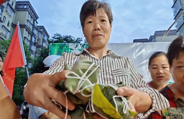 包粽子比赛的环节热闹非凡,30名选手,10人一组,共计3组,每人仅包5个粽子,每组速度最快质量最佳者获胜,现场道具准备就绪,各参赛居民就位,大家都摩拳擦掌,跃跃欲试。只听主持人一声令下,比赛开始,参赛居民迅速进入状态,拿粽叶、舀糯米、套绳索,整套动作一气呵成。比赛紧张激烈的进行着,大家斗争昂扬,最终决出3位获胜者。居民朋友们欣赏着精彩绝伦的节目,积极参与游戏环节,大家有说有笑,不亦乐乎。