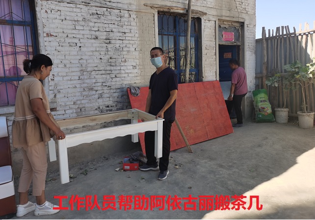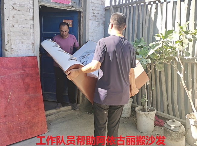 2020年7月11日,在入户走访中,一组阿依古丽·达吾提积极响应村里号召,把家里的大通铺换成了板床,买来了沙发、茶几等家具,家里就她和帕提曼两个人,正愁没办法往里搬呢。工作队员见此情形,立即动手帮助她把沙发、茶几擦干净后,依次搬进房子摆放好。