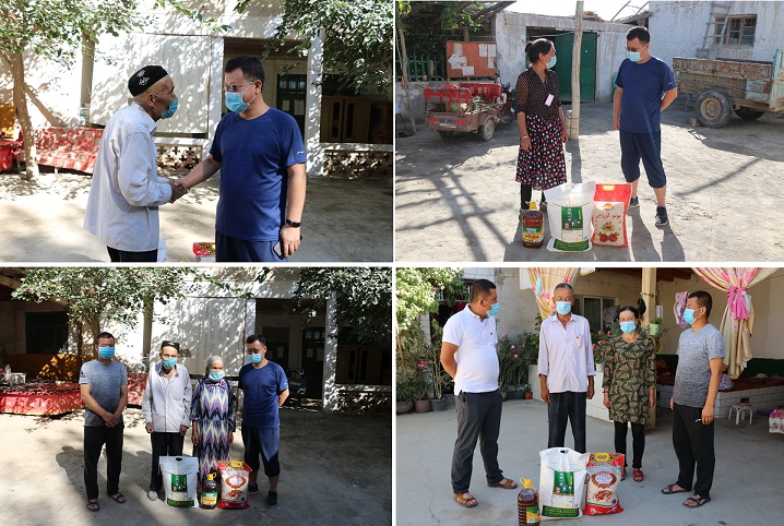 清风网讯(新疆农业大学:李婷、田永虎 / 摄影:艾比冉依木江·买买提明)在古尔邦节来临之际,尤其在疫情期间,为把节日问候和祝福及时送到困难群众心中,从精神上和物质上给予村民更多的关心和帮助,7月30日,新疆农业大学党委常委、宣传部部长、驻村工作队总领队、驻托万克拜什艾日克村工作队队长康华带领工作队全体队员、部分村干部满载着党和政府的深情厚谊,分别走入辖区内贫困户、四老人员、村干部等22户家庭进行节日走访慰问,在慰问活动中,给困难家庭送去了米、面、油等慰问物品和节日祝福。