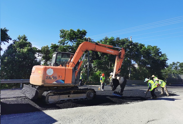 笔者来到今年湖北省松滋市公路大中修工程G351台小线标段斯家场处施工现场。刚打开车门,一股热浪扑面而来。不远处,引擎轰鸣。运装沥青料的车辆来回奔忙,七八名头戴标志帽,脚穿胶底鞋,挥舞着铁锹的养护工正在热浪滚滚的作业面穿梭忙碌。混合料不断从摊铺机上卸下,碰到一些边边角角或者机械摊铺不够密实的地方,他们及时用铁锹不停补料、找平,清理整形,随后压路机进行来回碾压,牢牢地将沥青料碾压密实、平整。施工单位路翔公司副总经理唐华伟告诉笔者,清晨5点多钟,养护工人们就早早出发了,高温天气正是路面坑槽填补、封油罩面的最佳时机,为了达到良好的处理效果,他们可顾不上天气预报里的各种“高温预警”,全副武装穿上养护安全标志服,便上路干起活来了。