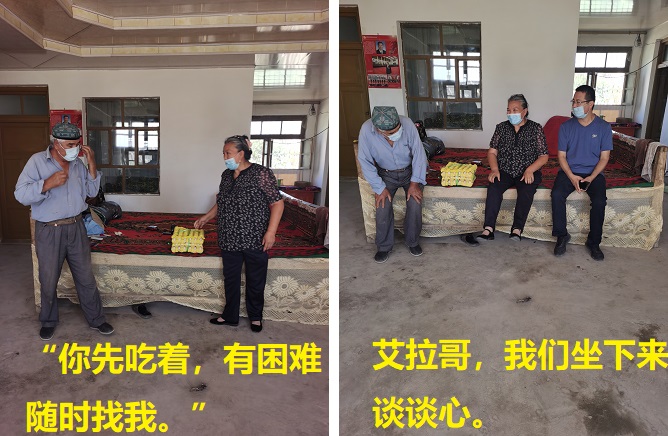 我的结亲对象在三组,他叫艾拉·祖布冬,老两口就一个儿子,现在外务工,平常家里就只有他们两个人。在日常的入户走访中,我特别注意了解艾拉·祖布冬家的生产生活状况,特别是家里的困难诉求,生怕他们生产生活方面有啥困难。