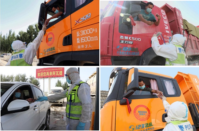 在抗击新冠肺炎疫情的斗争中,新疆阿瓦提县公安局S208公安检查站民警为过往司机送上夏季清凉中药饮品,得到群众的称赞。