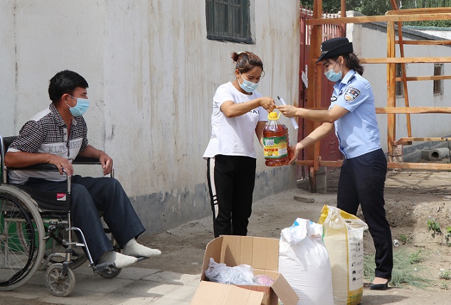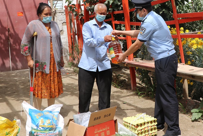 图1、2020年8月13日,阿瓦提县公安局民警卡力比努尔·阿不都热西提来到阿依巴格乡达康村生活困难群众艾买提·赛麦提的家中,为他家送去米面粮油和防疫药具。