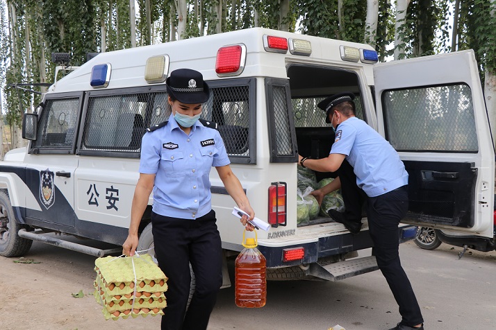 图2、2020年8月13日,阿瓦提县公安局民警李卓明为塔木托格拉克镇生活困难群众阿布都外力·吐尔逊送去生活必需品和防疫药具,把党和政府的温暖送到群众的心上。