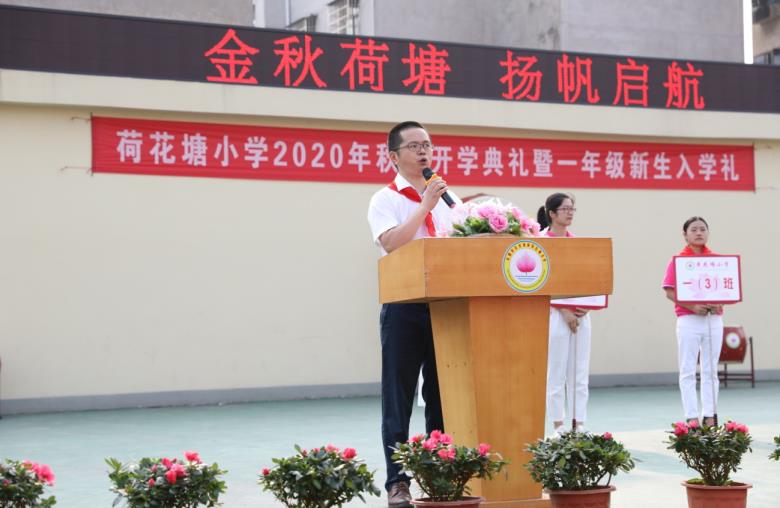 晏鸿斌校长在开学典礼上致辞,热烈欢迎14位老师和405位一年级小朋友加入荷花大家庭。他叮嘱老师们用渊博的知识开启他们的智慧,引导他们快乐走上求学之路。要求老师们关注每一位孩子,关注他们每一个方面,引导他们扣好人生第一粒扣子,迈好人生第一步。