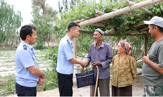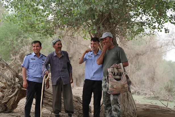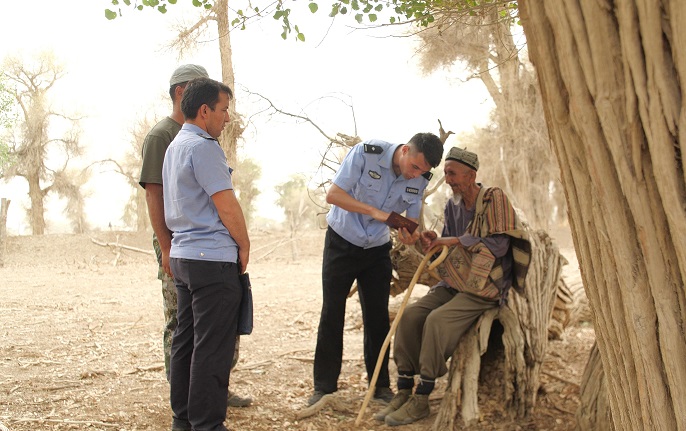 在这片胡杨林中,民警不辞劳苦上门服务,几十公里路程飞沙扬土的赶来,遇到饭点,就留下来一起吃饭。