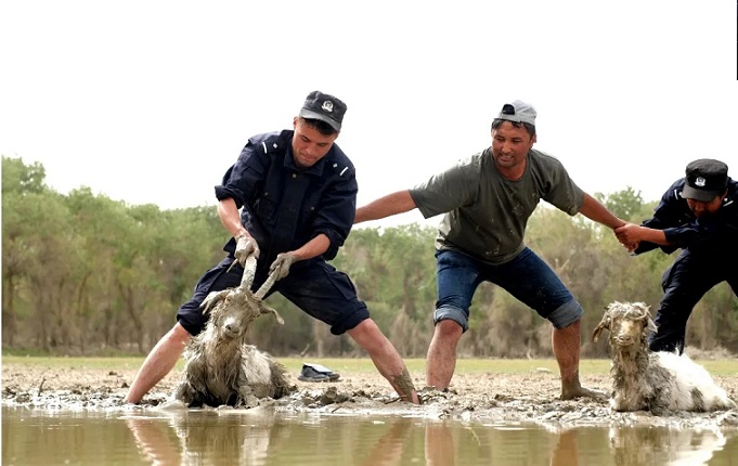 等待羊群走进浅水河滩时,无人机起飞拍摄时再次惊吓了羊群,我们想要的碧水蓝天、绿草白羊的静美镜头再次取景失败。此时羊群已不受控制地跑向胡杨林深处。76岁的依米提大爷的和他50多岁的儿子熟练而又矫健地绕远路从胡杨林的另一头包抄了头羊,并将羊群赶入就近的羊圈,才使局面得以控制。