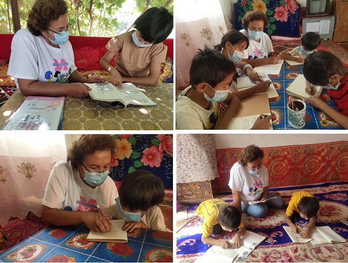 9月8日,阿瓦提县水利局驻英艾日克镇吐格曼贝希村工作队第一书记张成斌与工作队队员马依努尔·吐尔迪在入户走访中发现该村五组群众帕塔木·尤努斯母女两人正在家中学习国语并进行语言交流。