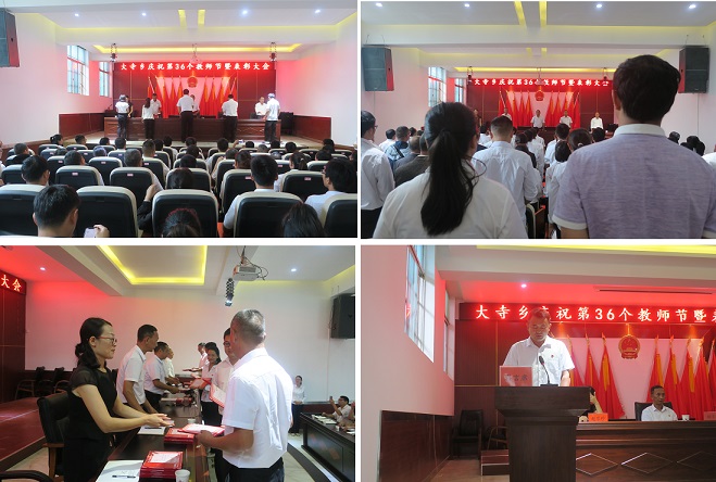 大会在庄严国歌声中隆重拉开帷幕。会上,总结回顾了一年来大寺乡的教育教学工作,并对在教育战线上做出突出贡献的8个先进集体和39名先进个人进行表彰奖励。随后,获奖代表进行交流发言。最后,乡党委、政府再次向辛勤工作在教育战线的广大教师和教育工作者送上节日慰问和祝福。