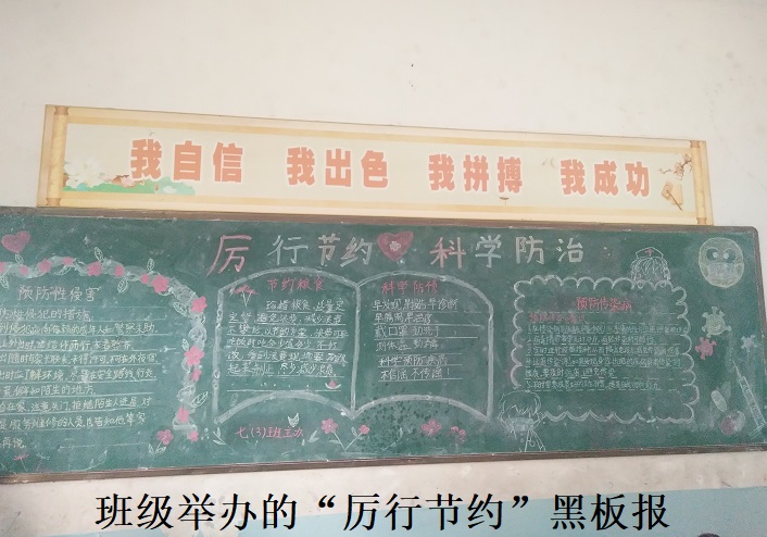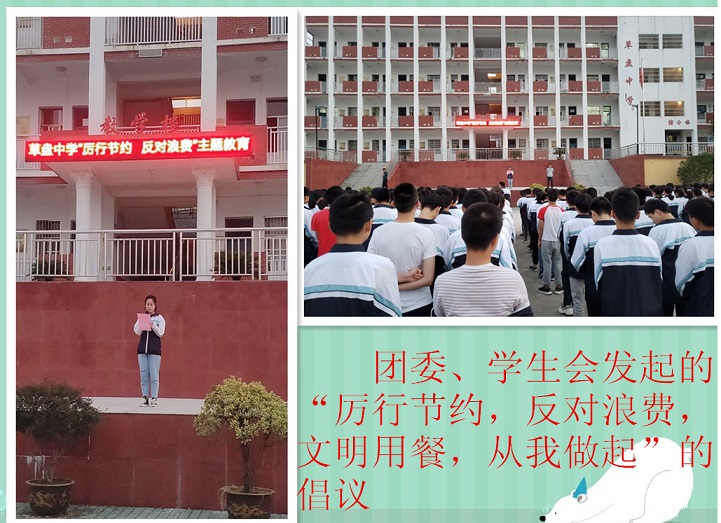 二是草盘中学团委和学生会联合在学生中发出“厉行节约,反对浪费,文明用餐,从我做起”的倡议,倡议全体学生在食堂就餐时,少取多跑,量力就餐,做到不浪费粮食。各班还积极举办“厉行节约”主题的黑板报,将节约粮食的思想牢记在心,并付之于行动。