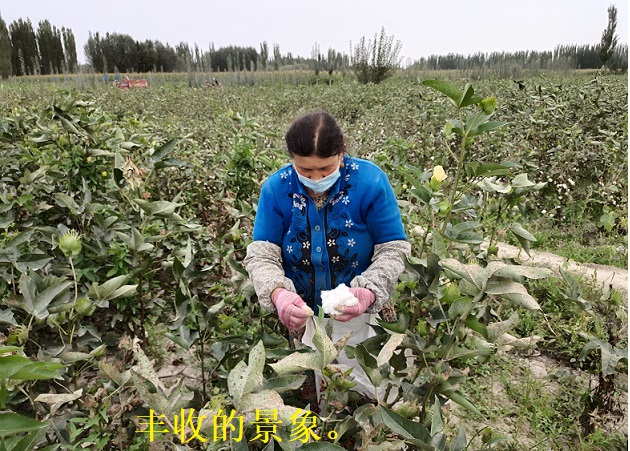 棉枝上结满了桃子般的棉桃,一棵上有十几个,压得棉枝弯下腰。微风一吹,沉甸甸地上下摆动.好像在向人们点头致意。已开着的棉花像天真无邪的孩童在灿烂的笑着。孩子伸手摘下雪白的棉花递给阿丽吐汗·艾来克,捡棉花让孩子体验了劳动的快乐、享受了丰收的喜悦。