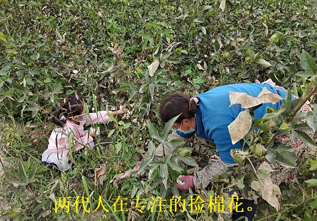 “妈妈,棉花白白的好漂亮,拿在手里绵绵的更舒服,捡棉花太有意义了……”孩子无忧无虑的童真挂在脸上。