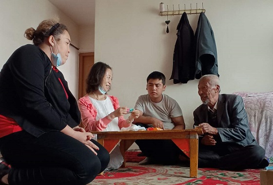 在结亲对象坎拜尼沙家中,访惠聚工作队队长陈静亲切地问道“家里的收入怎么样?孩子学习情况怎么样?老人的身体怎么样?” 经过详细询问结亲户家中的生产生活及身体情况,叮嘱他们保重身体,同时在入户中宣讲了党的十九大精神及惠民政策,并鼓励他们保持积极乐观的生活态度,如果生活上有任何困难要第一时间反映,社区工作队将积极给予帮助。