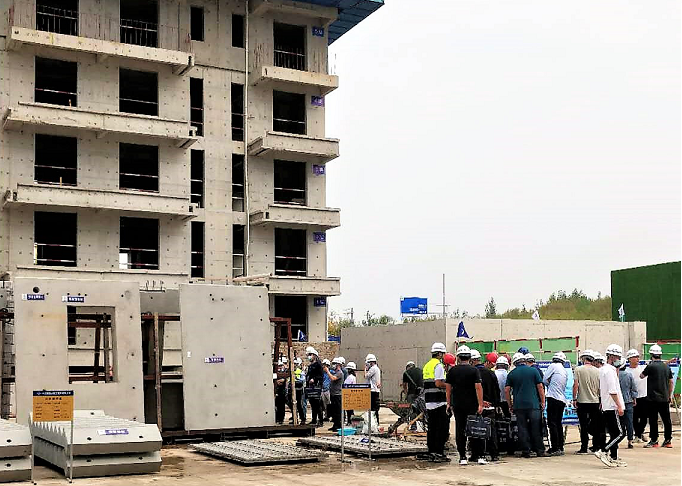 在省直青年人才公寓航港南苑工程参观过程中,参训员工认真了解了装配式PC构件制作、BIM应用、铝模应用、套筒灌浆、ALC隔墙安装等施工工艺,并就工程质安环及自营管理等细节问题向项目管理者进行了虚心的请教。