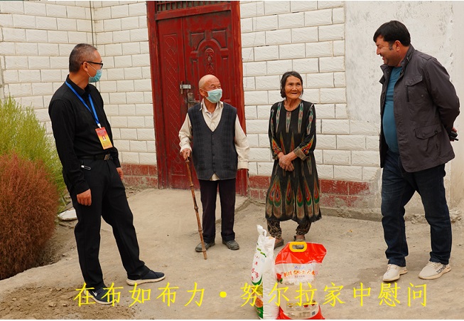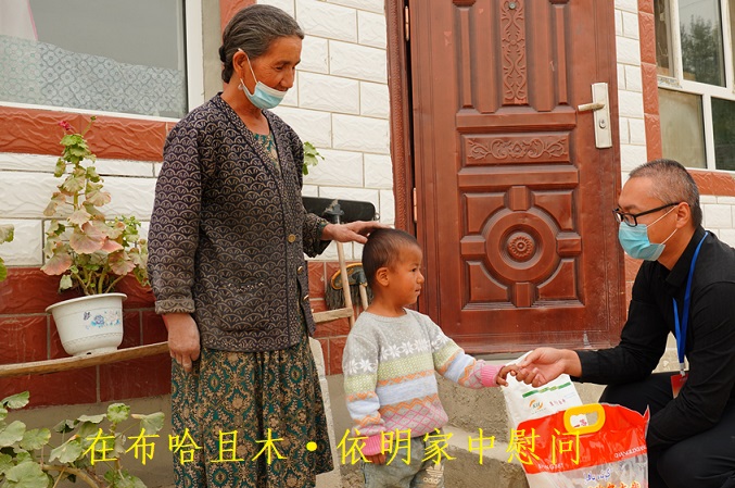 村民布哈且木·依明家中,孩子都在外地务工家中只有一位老人和孩子居住,见到工作队前来慰问,激动的说:工作队的老师们常来看我,今天还给我送来这么多东西,心里感到特别高兴!虽然我孩子不在身边,但有你们的照顾我并不觉得孤单,感谢你们一直以来的关心。