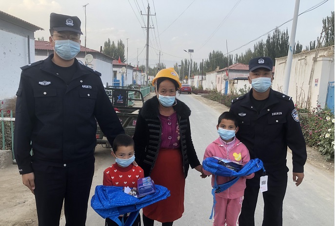 在亲戚阿孜古丽·恰尔西的家中民警阿迪力·亚森专门给她两个正在上学孩子带来学习用品,阿迪力仔细询问了她们的生活、学习情况,鼓励要克服困难,在逆境中自强不息、刻苦学习,争取以优异的成绩,回报父母、回报学校、回报社会。