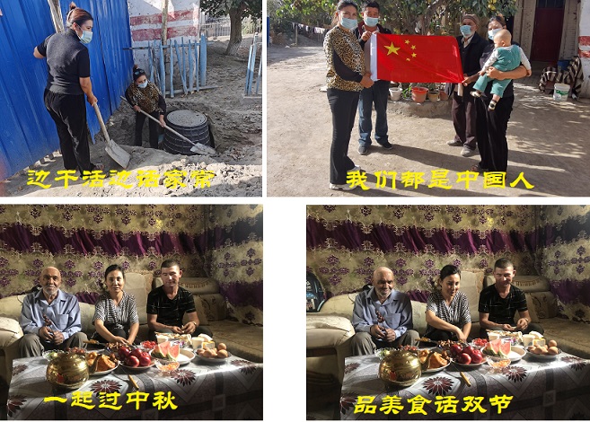 看到美丽来了,一家人拉着美丽一起拍了合影留念,并说:“我们都是中国人,我们都是一家人。以后累了、想家了就到这里来,我家大门随时向你敞开”拍完照拉着美丽克扎提和他们一起共进午餐,桌子上摆满了美食,有时令水果,也有新疆特色烤肉、馓子、油饼等,大家围坐在一起,你一言我一语,话中华、聊中秋,讲述中秋节的由来和中华历史文化的渊源;讲团结、感党恩,分享发生在身边一个个民族团结感人故事,讲述近年来草场村群众生产生活发生的巨大变化。