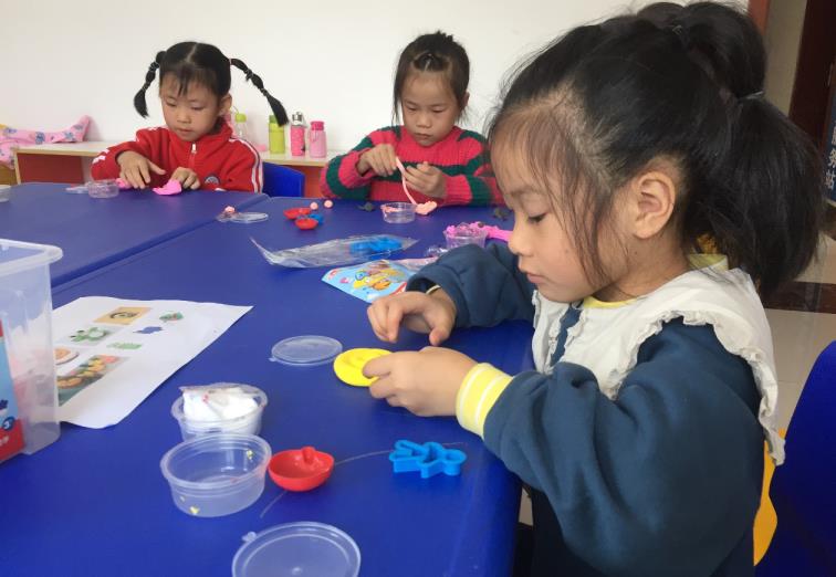 “创作”过程中的孩子们个个神采飞扬,活力十足,“搓”、“团”、“压”、“切”——大家充分发挥着想象力,一双双小手忙个不停,一眨眼的工夫,呆板的橡皮泥,摇身一变,成了香甜诱人的“汤圆”、华贵的“珠宝首饰”、可爱有趣的“小动物”……制作完成后,大家兴致勃勃地展示着自己最满意的作品,脸上洋溢着成功的喜悦。
