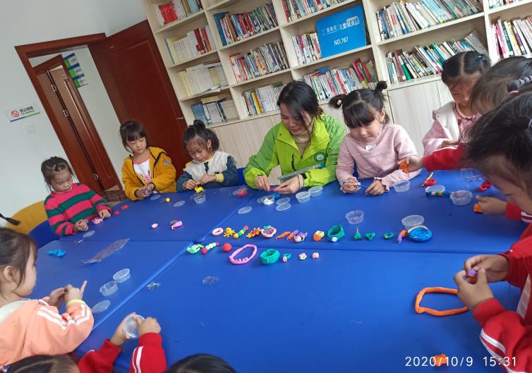 10月9日下午,在株洲醴陵市仙岳山街道碧山社区壹乐园儿童服务站,社工赖玲玲带领十多名小朋友,在站内开展了一场趣味益智橡皮泥活动。