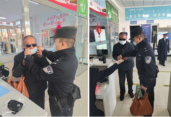 “您好,我是警察,请问您需要帮助吗?”听到民警询问后,该旅客表示其存在视力障碍,且没有家人陪伴,出行非常不便。经了解,该旅客要乘坐当日由二连浩特开往呼和浩特的6858次列车前往土牧尔台站,因行动不便,乘车途中耽误了不少时间,此时他乘坐的列车马上就要发车了。得知情况后,民警主动上前帮该旅客提拉行李,见其未戴口罩,还拿出自备的口罩为其戴上,之后民警一路护送该旅客到列车上,并嘱咐列车上的工作人员对其进行照顾。