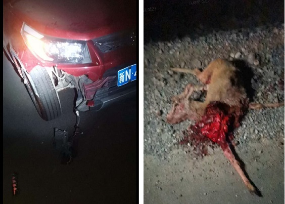 牙满苏边境派出所喀拉玉勒滚村警务室民警接到报警后迅速赶到现场,到达现场后确定被撞动物是属国家二级保护动物——黄羊,受伤严重已经死亡,肇事车辆车头也受损严重。随后,民警将现场保护并联系了交警大队及森林派出所,目前事故原因以及后续处理事宜已移交交警大队处理。