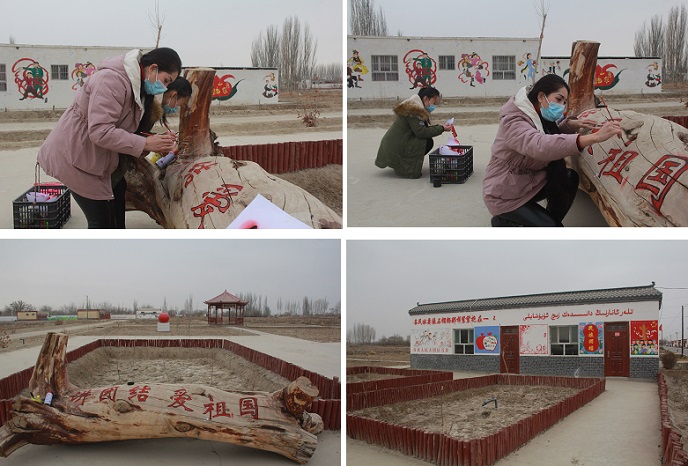 12月4日,阿瓦提县塔木托格拉克镇拉帕村幼儿园教师正在石榴广场喷绘“讲团结、爱祖国”的字样。今年,该镇创建自治区“民族团结示范镇”,20个行政村通过电子屏、宣传横幅 、绘制文化墙、雕刻“民族团结”相关字样,营造民族团结浓厚氛围,为美丽乡村增添靓丽风景。