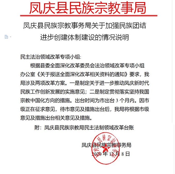 凤庆县民族宗教事务局关于加强民族团结进步创建体制建设的情况说明