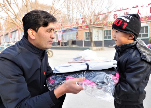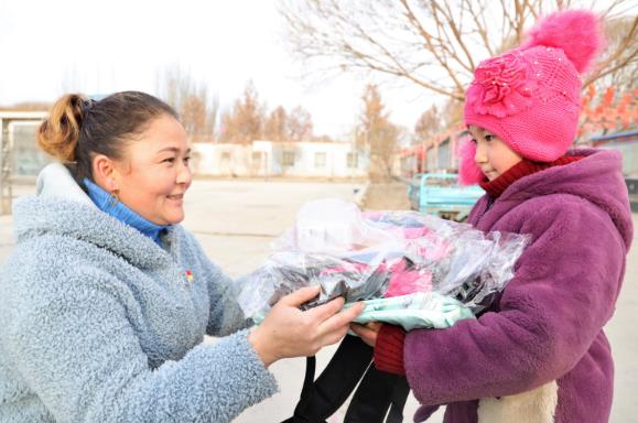 近日,新疆库车市组织组工干部深入贫困村看望慰问贫困户,为他们送去过冬用品。图为党员干部为贫困户家庭儿童赠送冬季保暖衣物。