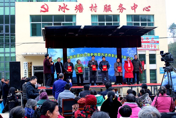 清风网邵阳讯(通讯员:刘志坚)12月12日下午,新邵县陈家坊镇冰塘村公德教育暨先进表彰颁奖典礼在村服务中心广场隆重举行,分别对胡德祥、戴国芸、戴胜英、戴来任、陈家生、戴煜等18户荣获平安家庭、文明卫生家庭、勤劳致富家庭、道德模范家庭、优秀共产党员和最美冰塘人的村民进行表彰。
