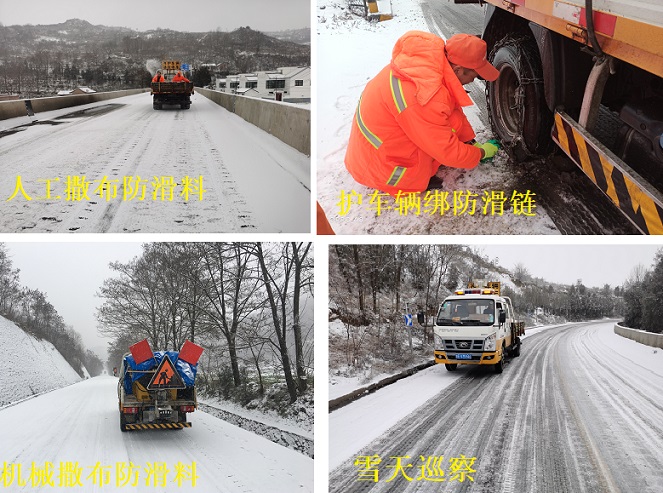 为尽快抢通道路,该段采取“机械+人工”相结合的方式进行除雪作业,在急湾、陡坡、长大下坡等重点路段撒布环保融雪剂,并在危险路段加强人员值守和增强救援力量,科学设置警示标志,积极引导过往司乘人员。