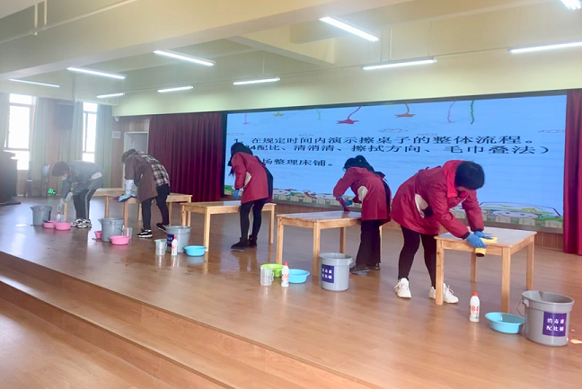 本次活动分为疫情防控理论知识测试与抢答、活动室桌子擦拭消毒流程演示、现场叠被子,班级内务整理评比四个环节。比赛中,保育老师们动作娴熟,各显其能,展现出自己最好的水平,体现了她们平凡工作中的不凡之处。