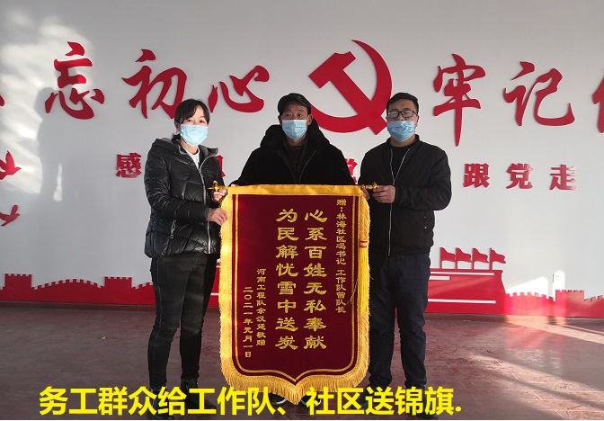 清风网讯(阿克市人大驻阿克市红旗坡片区林海社区工作队 : 韩欣)2021年1月1日新年新气象,一大早务工群众余汉庭冒着严寒来到社区将一面写着“为民解忧雪中送炭、心系百姓无私奉献”的锦旗交到阿克苏市人大驻阿克苏市红旗坡片区管委会林海工作队队长曾勤手中。
