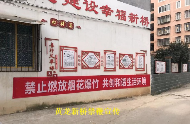 强宣传抓引导。新桥社区在社区发放《关于禁鞭致黄龙镇全体居民的一封信》1700余份;在辖区醒目的位置共悬挂横幅9条、张贴禁鞭通知610余份;充分发挥社区党员群、流动党员群、各组居民微信平台作用进行广泛宣传;利用禁鞭宣传车在黄龙镇街道及社区各组小巷进行全天宣传。同时,专班成员坚持每天上门入户,积极开展宣传教育,从而使禁鞭工作的目的意义家喻户晓。特别是元旦前后,根据放假前后在外务工返乡过节人多的现状,社区再次组织专班进行入户宣传,掀起禁鞭工作宣传高潮。新桥社区五组居民徐健同志父亲去世,积极响应禁鞭政策,晚上及早上送葬路上未放一响鞭炮。